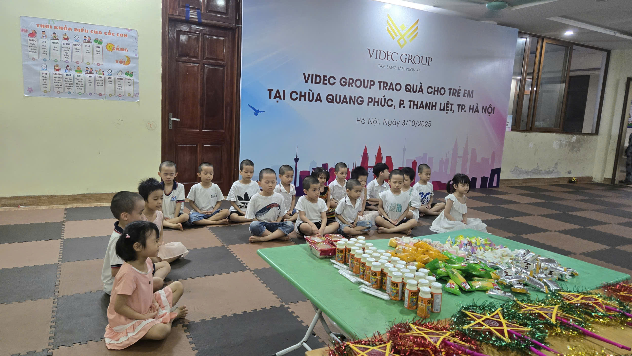 Ngày 03/10/2025, VIDEC Group đã tổ chức hoạt động thiện nguyện tại Chùa Quang Phúc. Bên cạnh việc hỗ trợ tu sửa cơ sở vật chất, Tập đoàn đã trao tặng 50.000.000 VNĐ để góp phần nuôi dưỡng các em nhỏ tại chùa. Những món quà ý nghĩa này không chỉ mang tính vật chất mà còn chứa đựng tình cảm, sự sẻ chia và niềm tin yêu gửi đến các em nhân dịp Tết Trung thu.