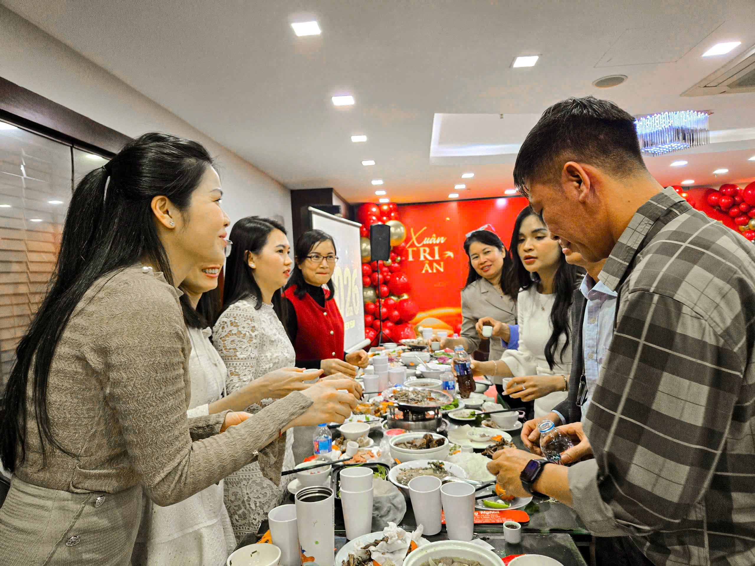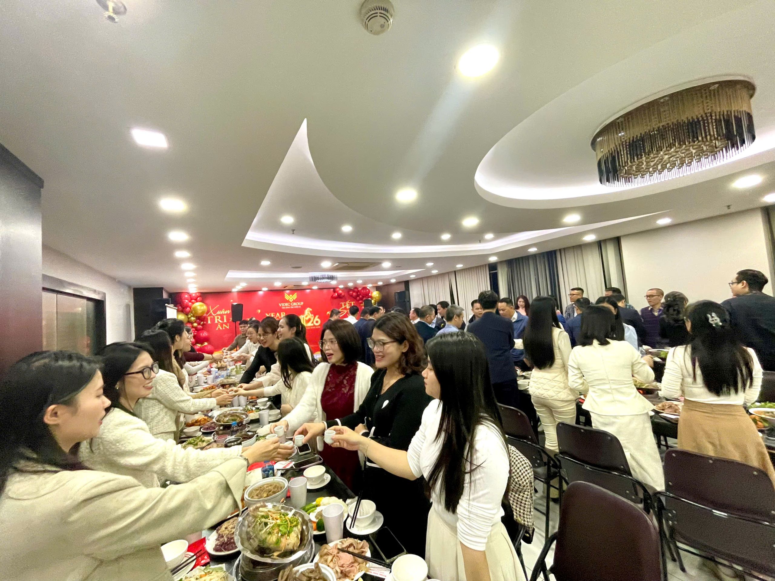 Ngay sau phần phát biểu là nghi thức nâng ly chúc mừng năm mới – khoảnh khắc cả khán phòng cùng hòa chung một nhịp đập. Những ly rượu được nâng cao không chỉ để chúc mừng thành công đã đạt được, mà còn để gửi gắm niềm tin vào một năm mới hanh thông, thắng lợi và vững bền. Tinh thần “Xuân Tri Ân” được lan tỏa rõ nét trong từng ánh mắt, từng cái bắt tay, từng lời chúc gửi tới đồng nghiệp, lãnh đạo và đối tác – những người đã cùng nhau đi qua một hành trình đầy nỗ lực.